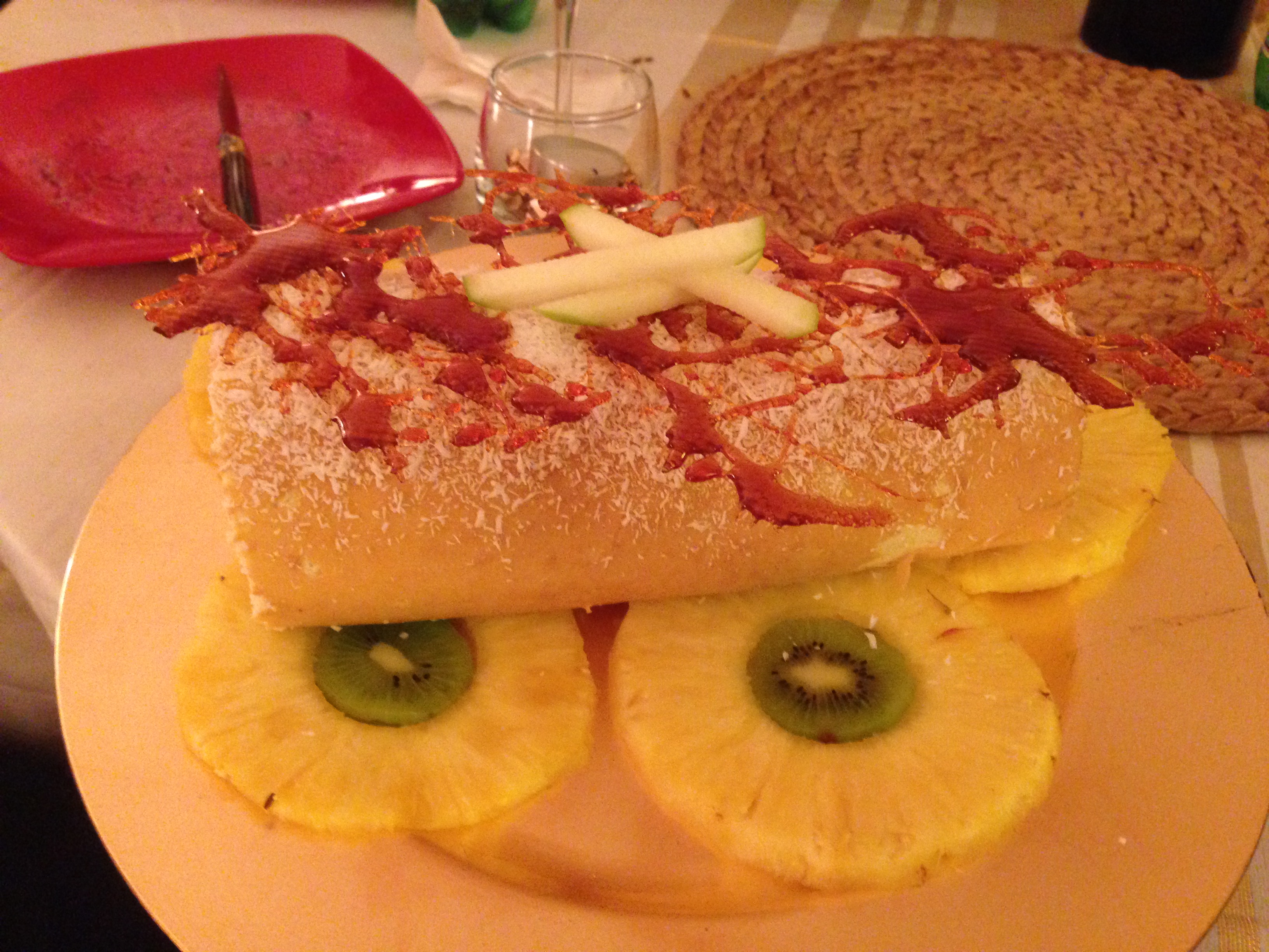 - Déroulez le biscuit refroidi, imbibez-le du mélange rhum-sirop de canne-eau (le dosage sera fait selon votre convenance) nappez-le de crème (à température ambiante), répartissez les fruits.