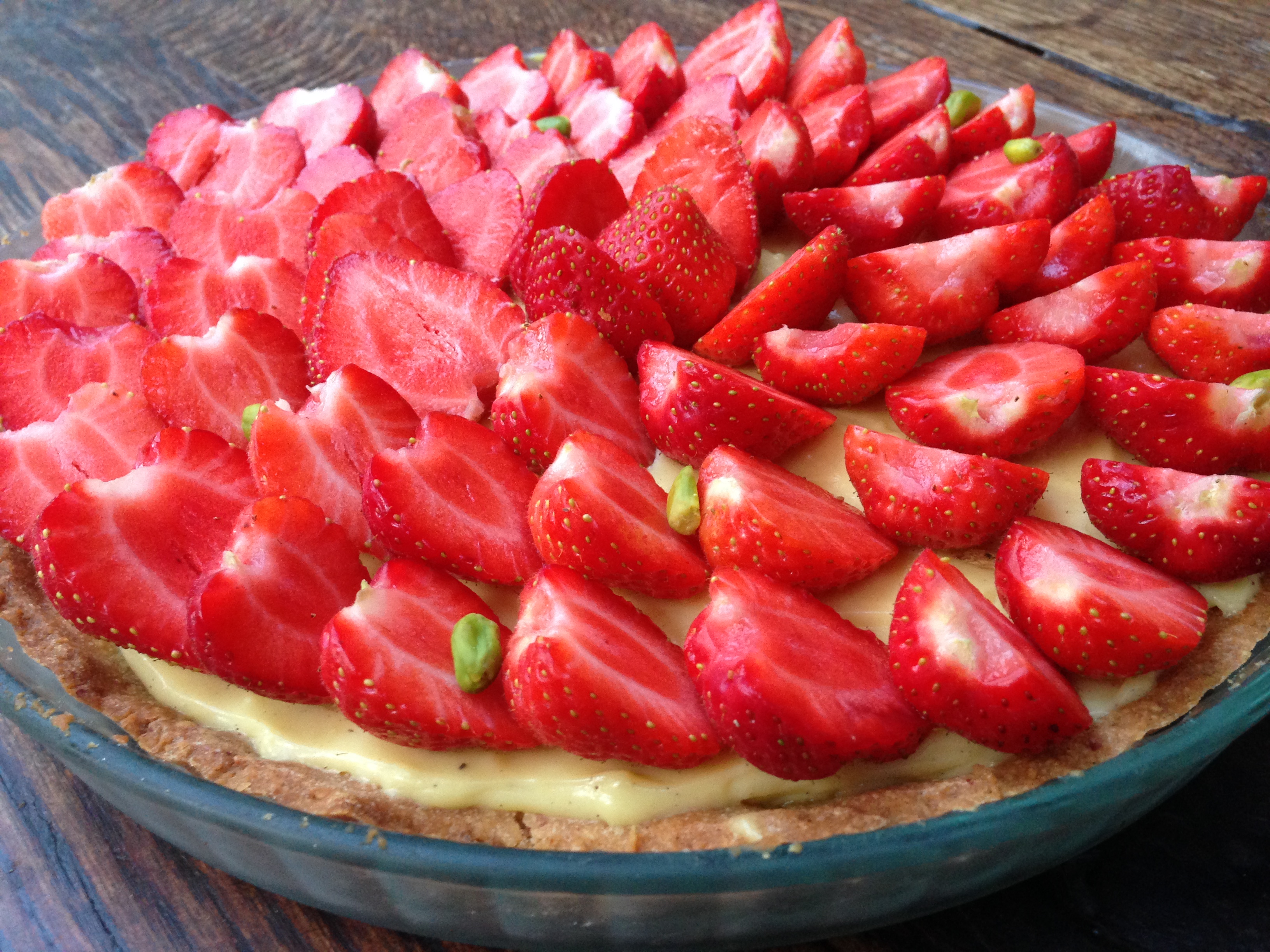 Et voici le dessert que j’ai fait pour l’anniversaire de mon père: ce qu’il avait demandé! Une tarte aux fraises! J’ai pioché cette recette dans le livre « la cuisine de Bernard » que je vous avais présenté pour la recette du clafoutis! Un grand classique, mais une première pour moi!
