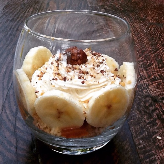 D’abord, révisons les bases, qu’est-ce-qu’un banoffee? Une tarte avec banane, confiture de lait et chantilly…Comment vous dire… C’est un dessert plutôt…costaud… Et je préfère les desserts plus légers, aériens, pas trop sucrés, etc. Donc j’étais sceptique quant à cette recette… Mais, comme toujours Môsieur Christophe MICHALAK (oui il mérite des capitales!) sait revisiter les classiques pour en faire des desserts originaux et supers, mégas, archis topissimes!!! (Excusez la qualité de la photo…)