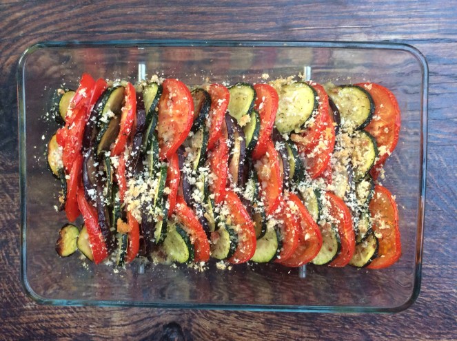 - Rangez les légumes verticalement dans le plat, en commençant par une rangée de tomates, puis de courgettes, et enfin d’aubergines. Continuez en alternant les légumes de la même façon. Pelez et râpez ou écrasez la seconde gousse d’ail et répartissez-la sur les légumes. Poivrez.