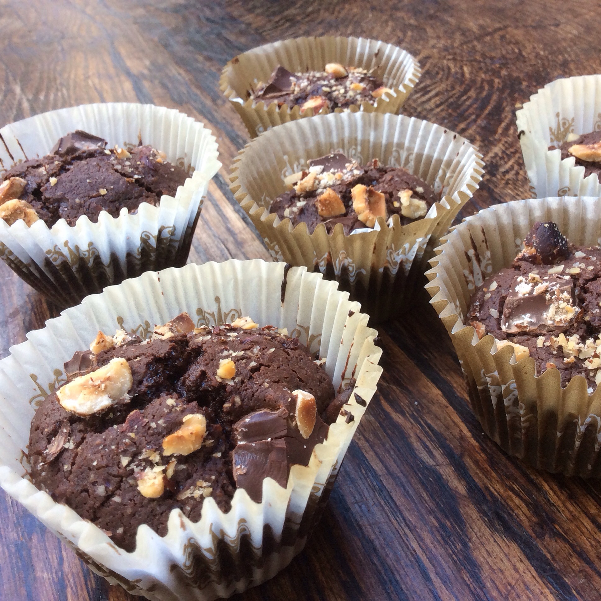 - Concassez les noisettes soit à l’aide d’un mixeur, soit mettez-les dans un torchon, pensez à quelqu’un que vous n’aimais pas et frappez fort le torchon rempli de noisettes sur votre plan de travail (technique Michalak bien sûr! ^^). Coupez les 100g de chocolat restants en grosses pépites et ajoutez le tout à la préparation (gardez-en un peu pour en décorer le dessus des muffins avant la cuisson).