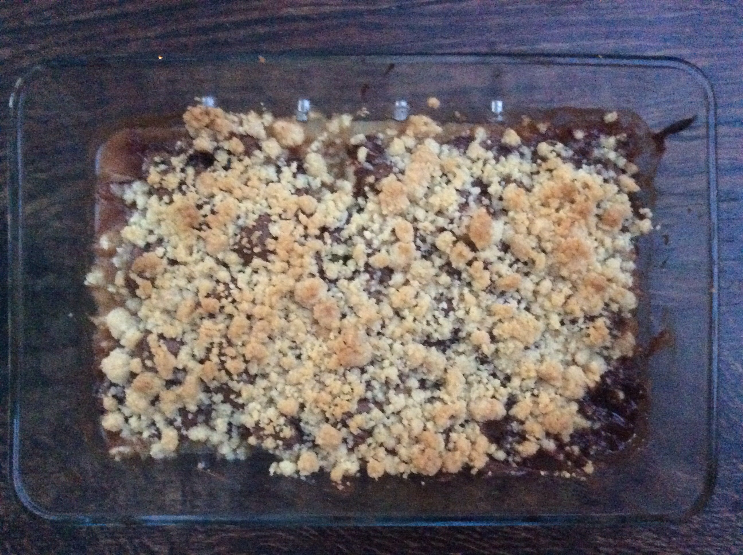 3. Répartissez ce mélange sur le Nutella et enfournez pour environ 25 minutes: le crumble doit prendre une jolie couleur dorée. Servir tiède (il est possible de réchauffer le crumble!).
