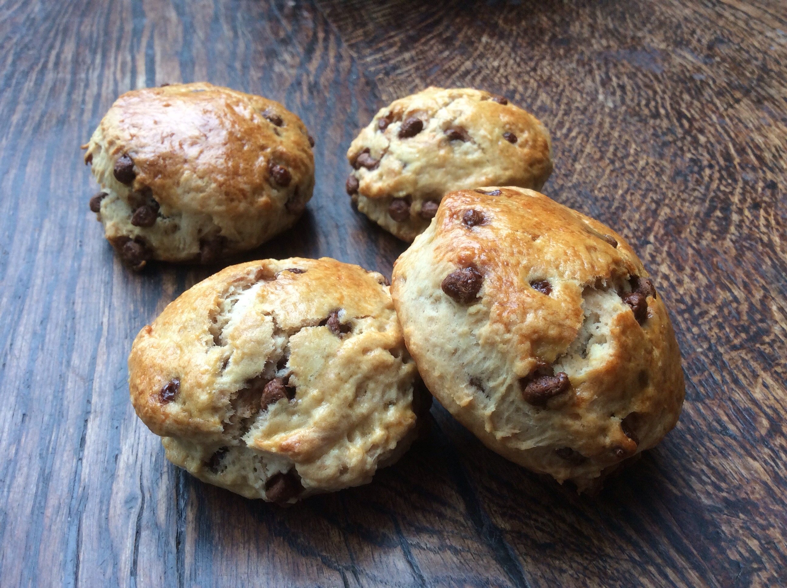 Je ne pensais pas tester une recette anglaise, mais après avoir vu un dossier spécial scones sur la plateforme Hellocoton, je suis tombée sur un blog génial, d’où vient cette recette: Lemon pie and tie and dye. Je vous incite à aller y faire un tour, c’est comme ça qu’on trouve des idées de recettes, ou autre (DIY, etc.). Bref pour en venir aux stars de cet article, les scones, c’est une recette hyper pratique (à transporter), rapide à faire (j’ai même eu le temps de faire une deuxième fois la pâte, car je n’avais pas assez de scones à mon goût!), ajustable aux goûts de chacun (j’ai mis des pépites de chocolat, mais on peut les laisser natures ou un autre ingrédient), et c’est un petit-déjeuner qui cale! Je compare cela à des petits pains aux pépites de chocolat, en plus dense. Accompagnés d’un thé, ils sont parfaits et conviennent aussi parfaitement pour le goûter. J’ai même réussi à convaincre mon père (qui s’en est goinfré) alors qu’il était loin d’être emballé par cette gourmandise anglaise!
