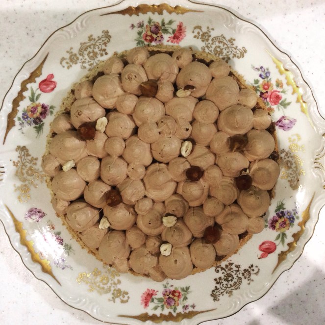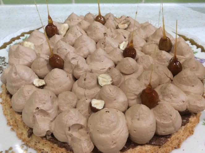 - Le dressage: Placez la dacquoise sur un plat de service, tartinez-la du croustillant praliné et parsemez de noisettes grillées concassées. A l’aide de la poche à douille, formez des boules de chantilly au chocolat au lait sur toute la surface du gâteau. Décorez-le à votre guise.