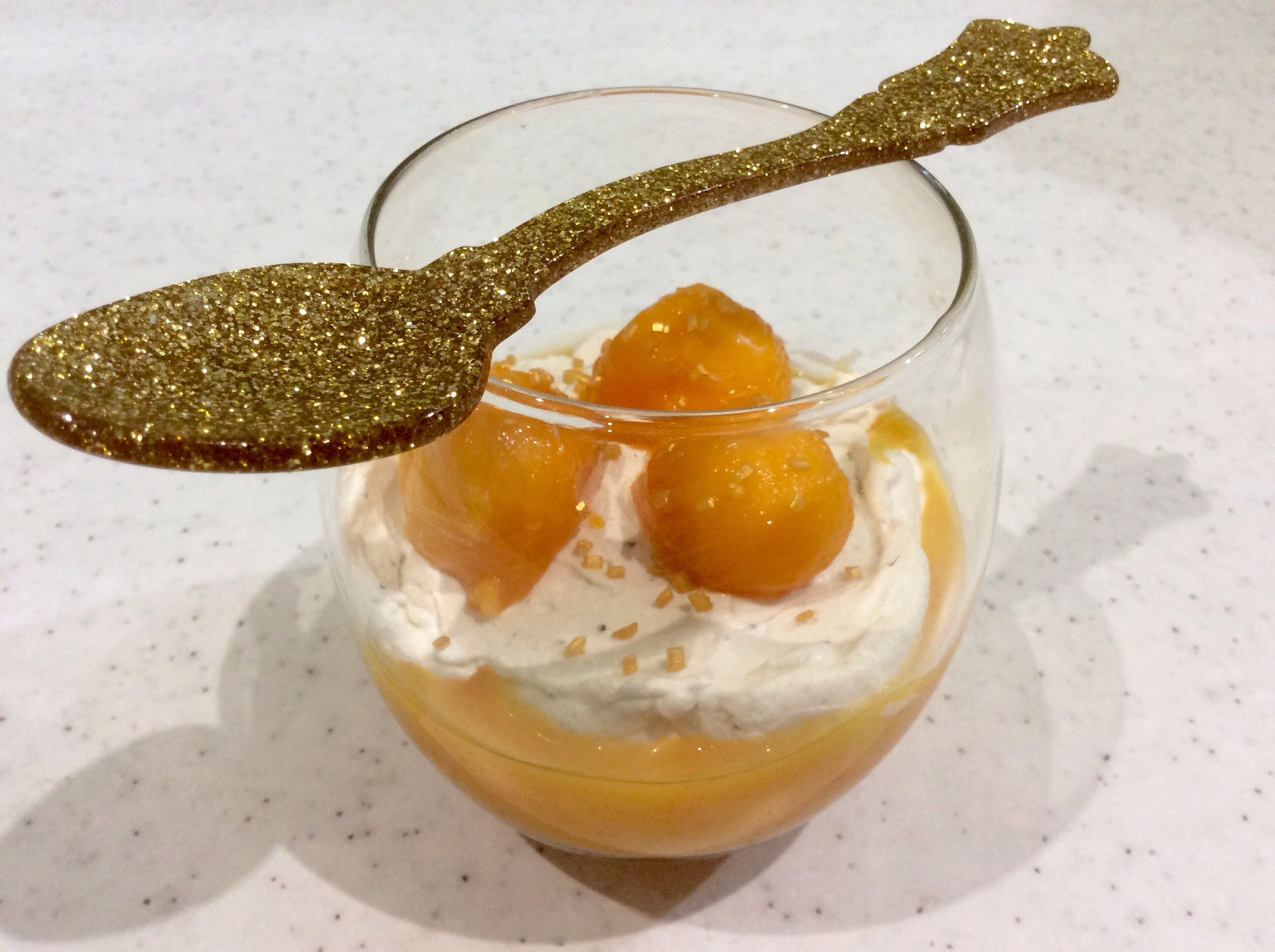 - Le dressage: Répartissez équitablement, dans les verrines le coulis puis à l’aide de 2 cuillères à soupe, garnissez les verrines de crème chantilly, un peu comme des îles au milieu du coulis (bah oui le nom est un peu recherché quand même…). Placez au centre de cette chantilly les 3 billes de mangue et parsemez de sucre doré. Placez au réfrigérateur 1 heure puis servez.
