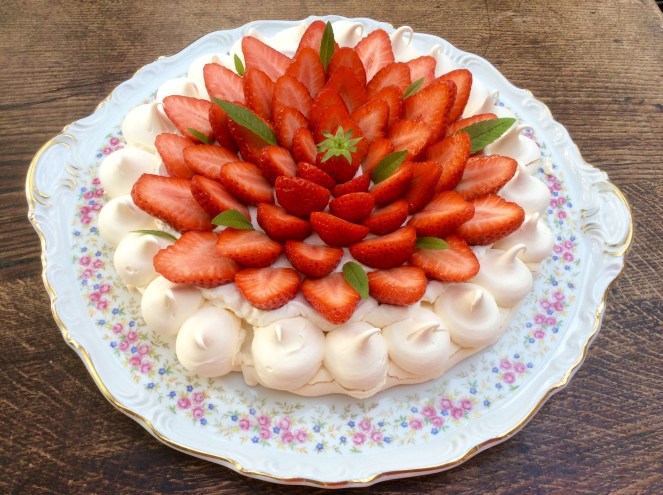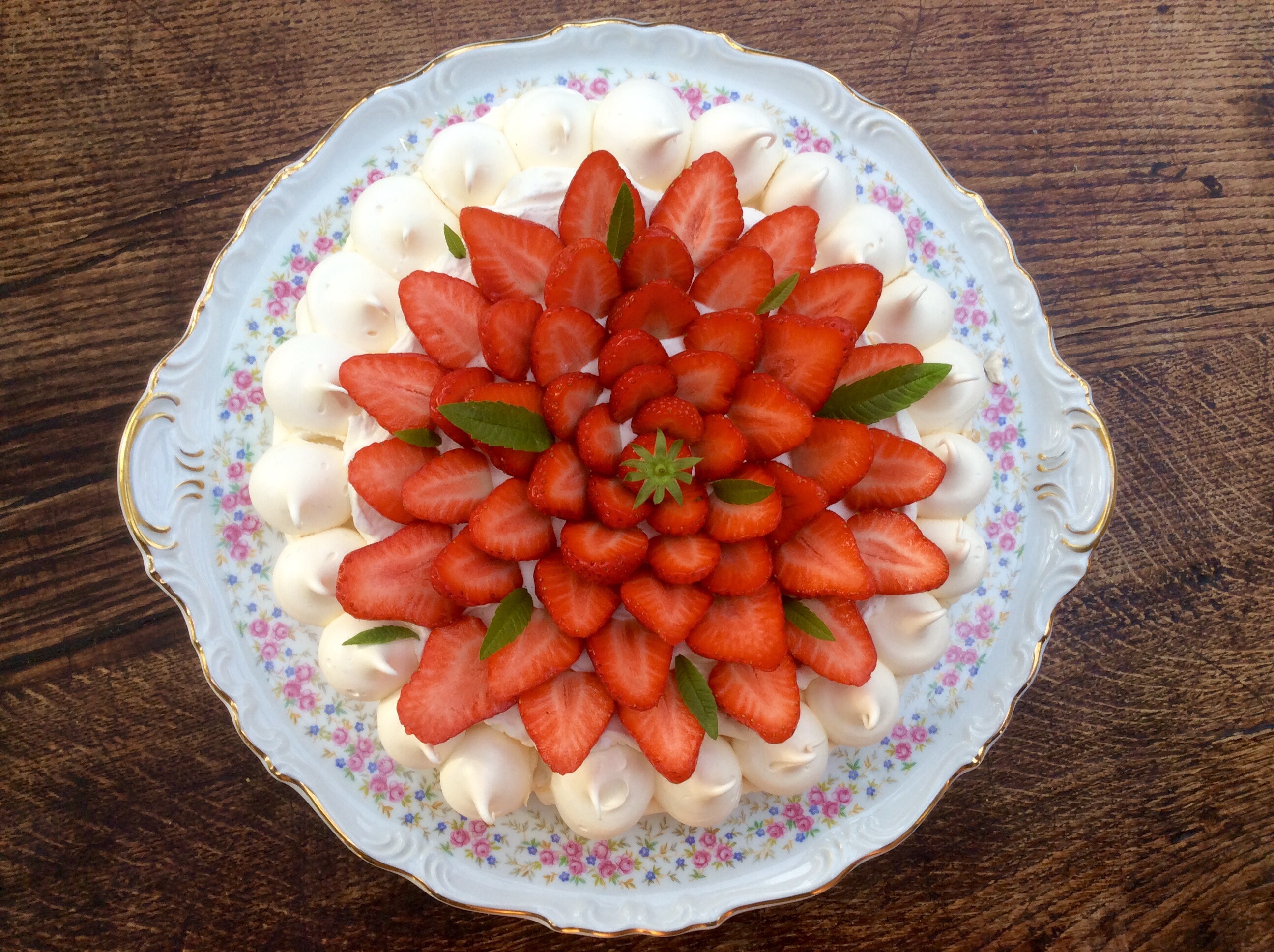 - Dressage: Coupez les fraises en 2, gardez-en une petite entière pour mettre au centre. Étalez la chantilly sur le disque de meringue et disposez les fraises comme sur la photo (ou selon votre envie, c’est votre Pavlova!) en commençant par l’extérieur. Disposez ici et là quelques feuilles de verveine.