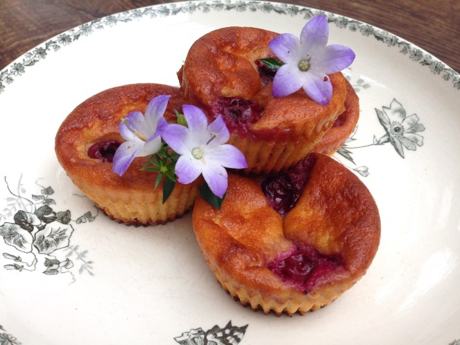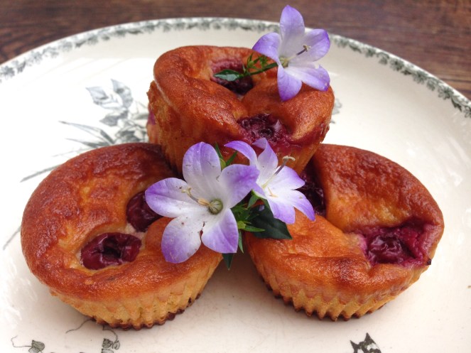 - Versez la pâte dans les moules (3/4), posez 2 cerises dans chaque moule et enfournez pour 25 à 30 minutes, en surveillant les 10 dernières minutes. Les gâteaux doivent être bien dorés.