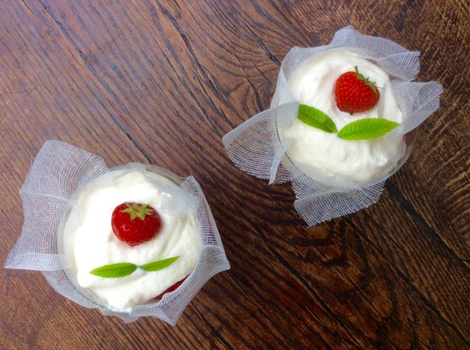 Je suis donc tombée sur la recette de fontainebleau de Christophe Michalak qui fait sa crème à partir de petits suisses (oui c’est pas du 0% non plus, il faut du goût!) et de blancs d’œufs montés en neige, parfait car pas de chantilly! Normalement il sert ça avec une compotée de rhubarbe mais j’ai préféré faire avec des fraises fraîches coupées et sucrées au sirop de verveine! Et c’est tout! Donc très simple et très rapide à faire, très frais, et fruité, j’aime beaucoup cette version qui, si on la laisse reposer une trentaine de minutes forme une mousse! Bien sûr vous pouvez faire ce dessert avec la compotée de rhubarbe!