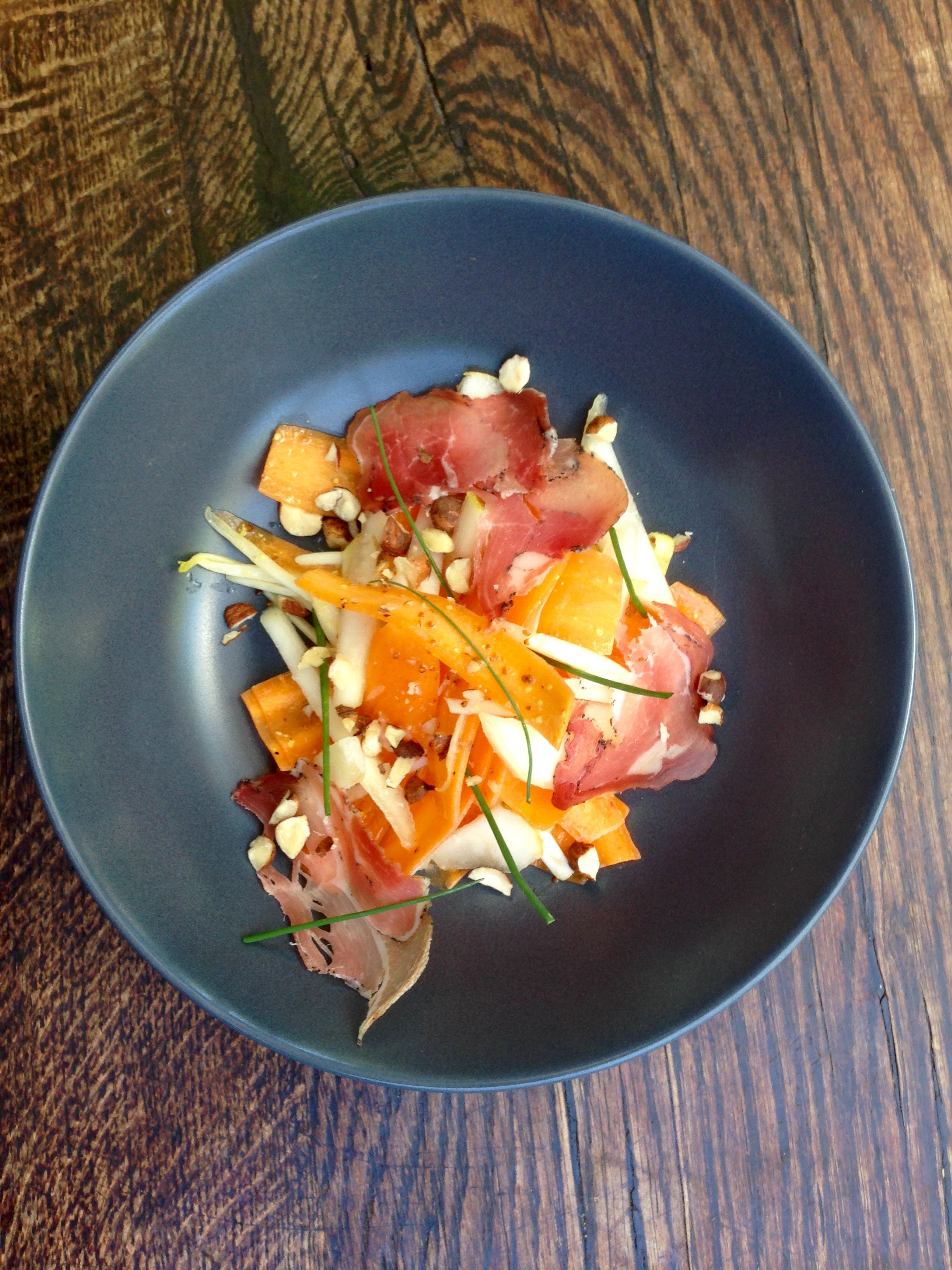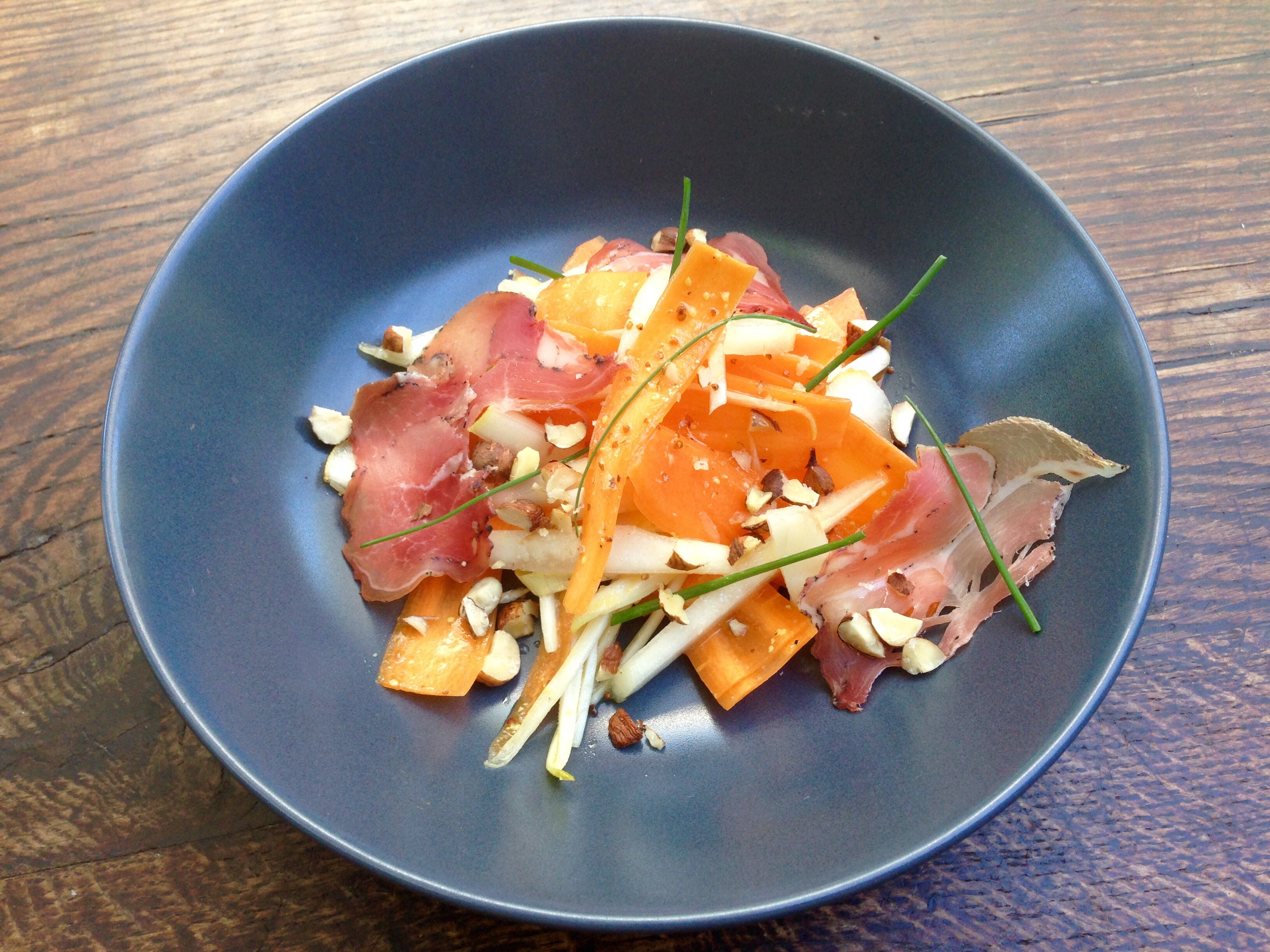 - Dressage de l’assiette: Répartissez les lamelles de carottes, d’endives et de poires dans 4 assiettes. Arrosez de vinaigrette, parsemez de noisettes concassées de ciboulette ciselée et déposez quelques tranches de coppa. Salez et poivrez légèrement de nouveau puis servez.