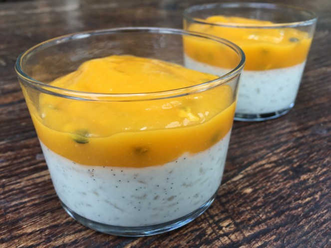 Le soir venu, le riz était encore tiède et pas assez crémeux malgré 1 heure de cuisson à feu doux, je n’étais donc pas très convaincue. Je l’ai re-goûté le lendemain midi frais et plus crémeux et compact, et j’ai trouvé ça plutôt bon! Crémeux, un peu comme un risotto avec des grains de riz plus cuits, sucré mais contrebalancé avec la purée de mangue-passion! Plutôt réconfortant comme dessert au final! Je vous conseillerai donc de réaliser cette recette la veille pour le lendemain.