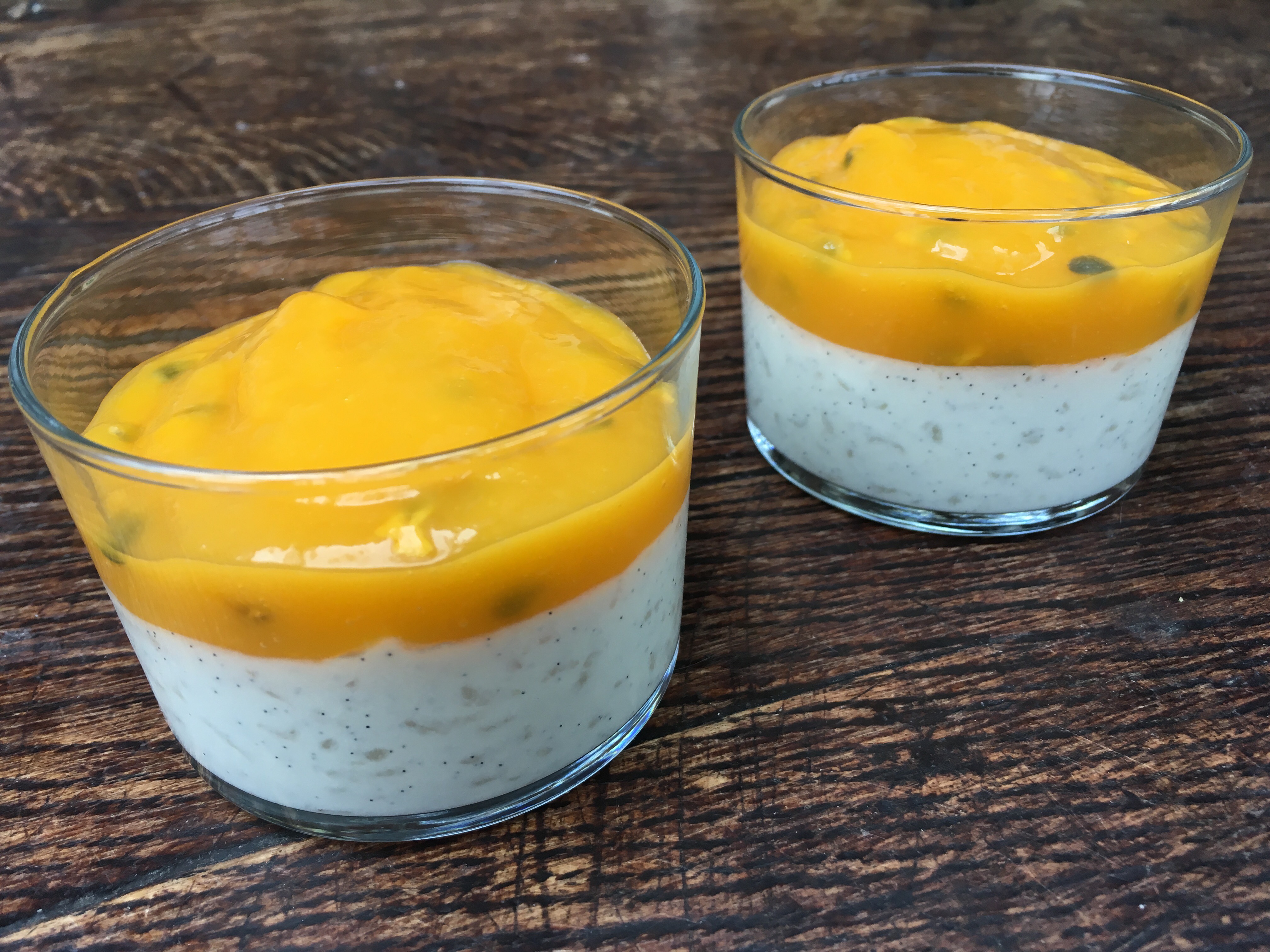 - Au moment de servir, répartissez le coulis de mangue-passion sur le riz au lait et servez !
